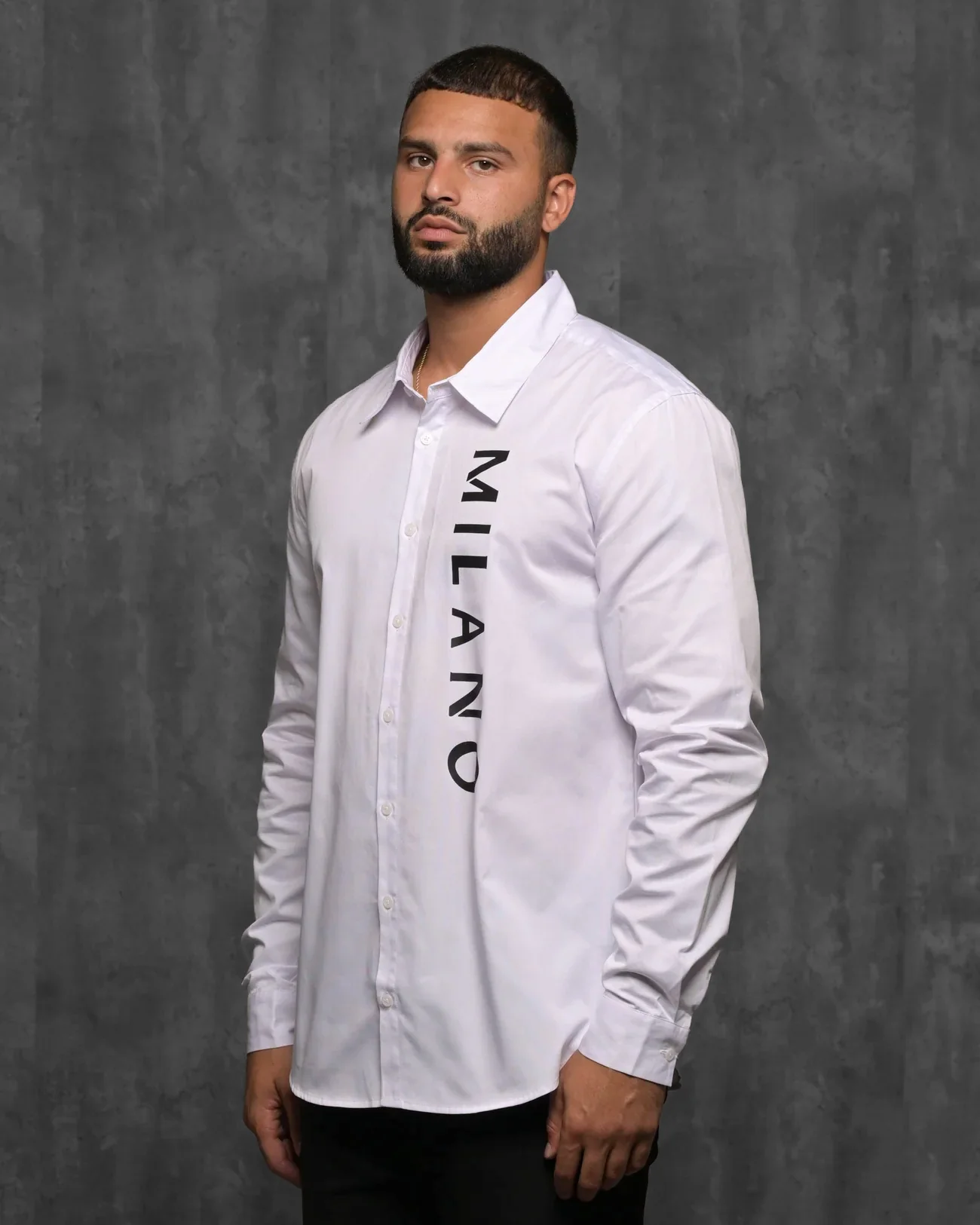 A woven classic-fit shirt featuring a button front, basic collar, long sleeves, "Milano" going down the left side of shirt, and a slightly curved hem.