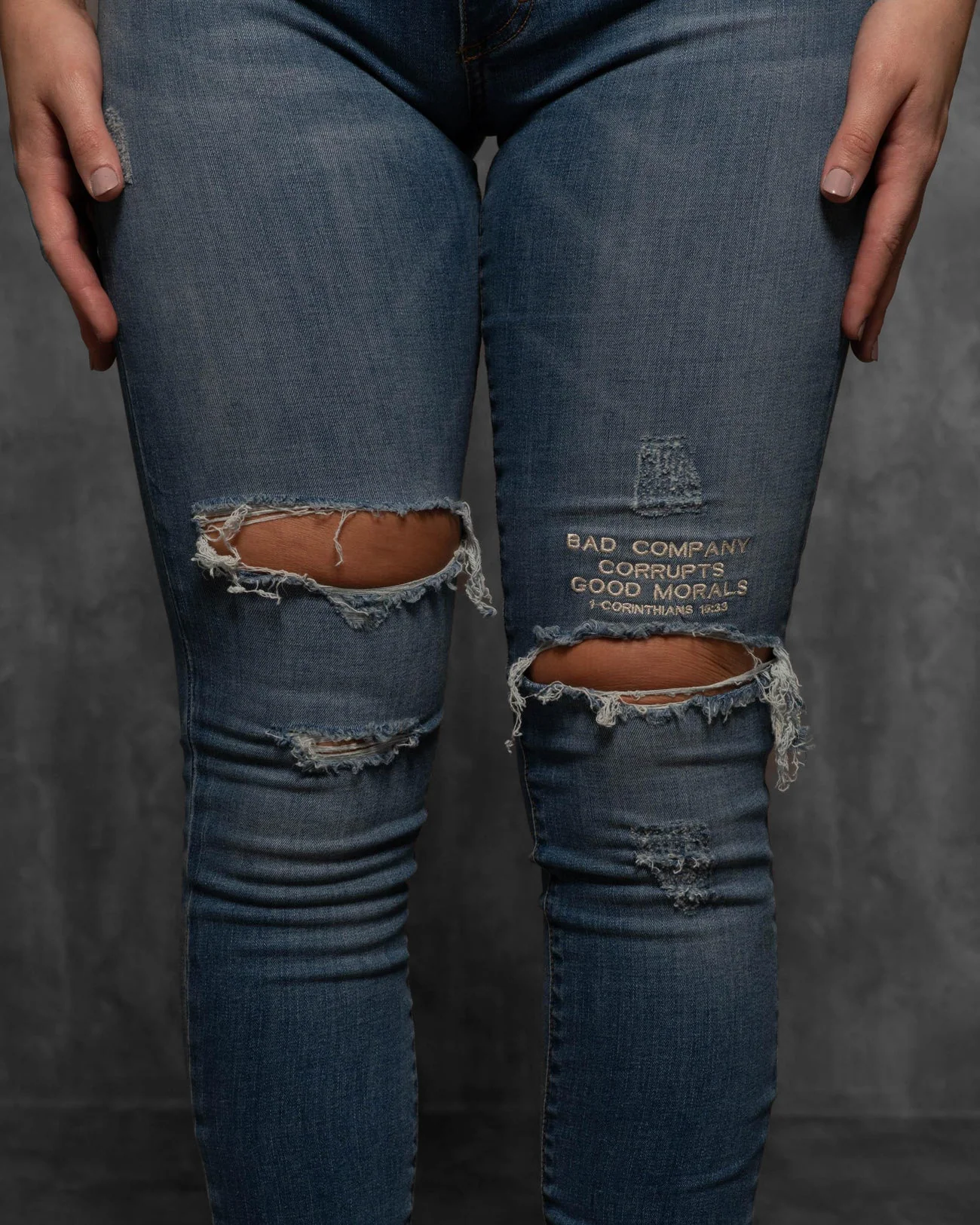 These mid-rise skinny jeans are a wardrobe staple! Designed exclusively for women with small waist and big hips, in mind; they’re constructed from the most incredible stretch denim. These are sure to cinch the waist and hug your perfect curves. Distress detailing allows you to dress them up or down, for any occasion! Our signature “Bad Company Corrupts Good Morals” quote embroidered above the right knee brings added flair to this perfect piece.
